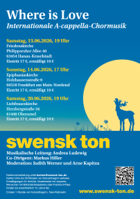 Swensk Ton, der in Frankfurt am Main ansässige A-cappella-Chor, hat sich in über 40 Jahren einen Ruf als einer der beständigsten und spannendsten Konzertchöre der Rhein-Main-Region erworben.
